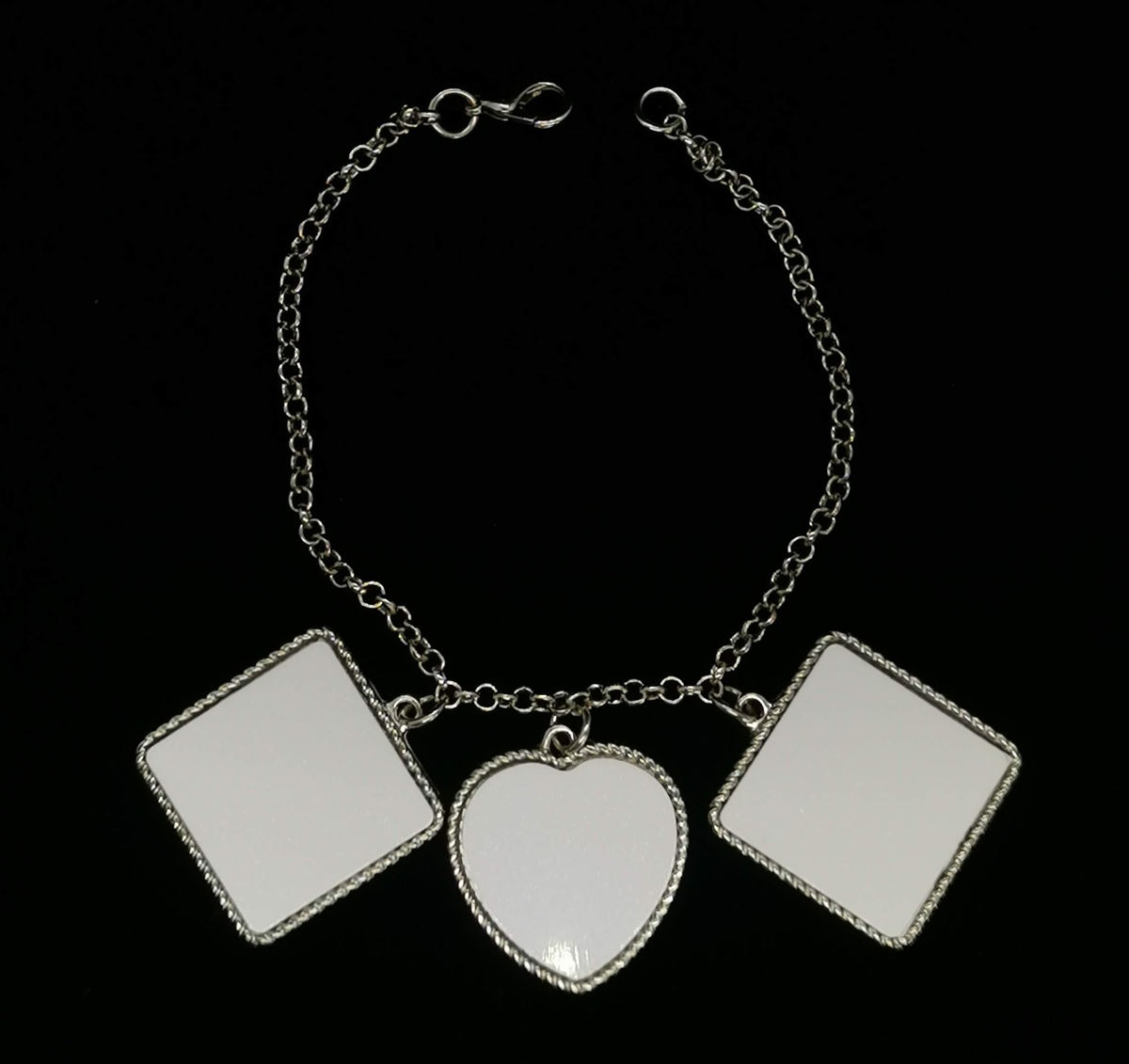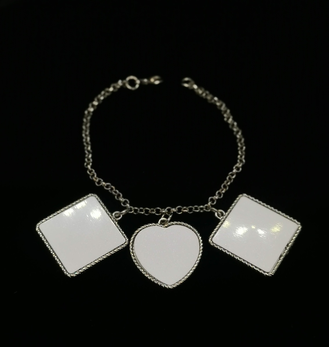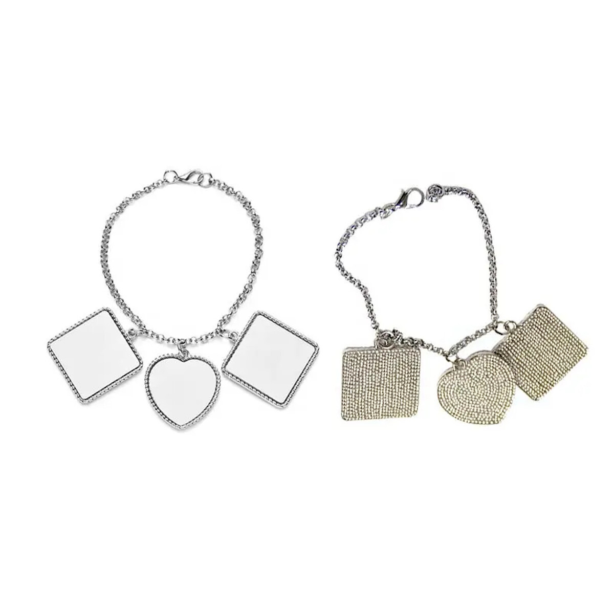 Add a touch of elegance and sentimentality with our Bracelet with Two Square Charms and One Heart Charm. This beautifully crafted piece features two square charms and a heart-shaped charm, each ready for customization with your favorite images, designs, or messages. Perfect as a heartfelt gift or a unique accessory for yourself, this bracelet blends timeless style with personal meaning, making it ideal for celebrating special memories or showcasing artistic expressions.
